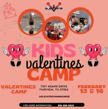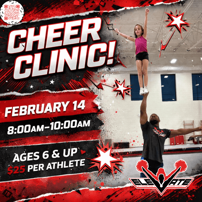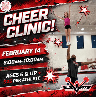 Saturday, February 14th we are hosting a very special cheer clinic here at Elevate! The clinic is open to athletes ages 6 and up and will last from 8:00am - 10:00am.