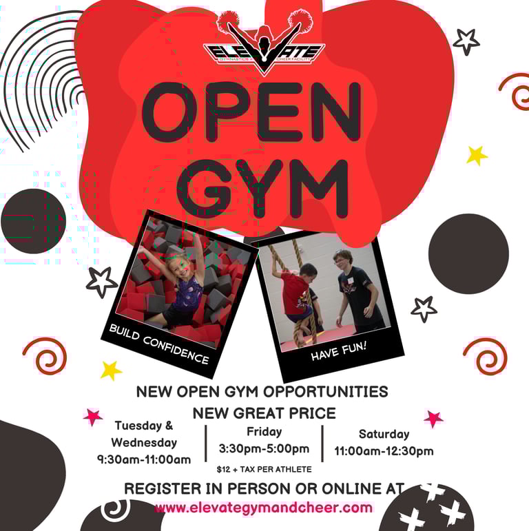 Build confidence while having fun! Our open gym schedule is now open 4 days a week to give more athletes a great opportunity to get into the gym! Whether it's your first time or you're a regular, come have fun with us here at Elevate!